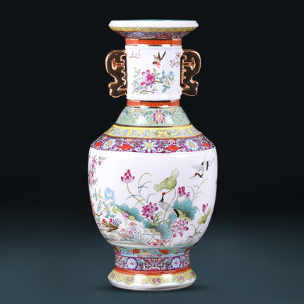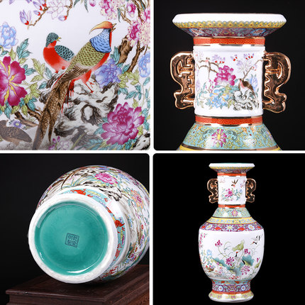 Extra Large vintage qing dynasty qian long two ears porcelain vase with birds and flowers in gold